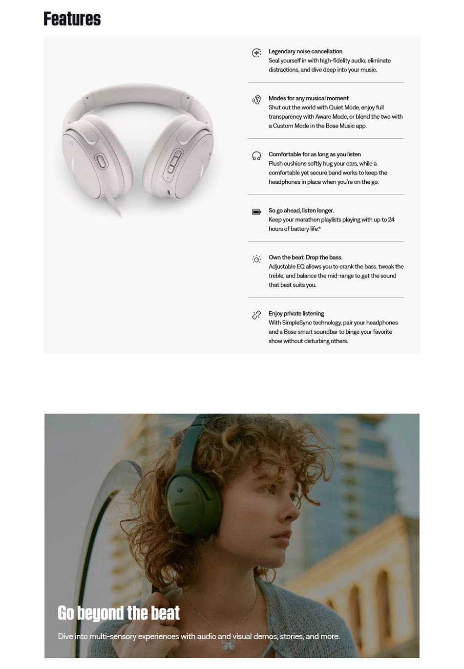 Take charge of your music and stride along to the beat. High-fidelity audio and legendary noise cancellation work their magic by sealing you in, eliminating distractions, and letting you dive deep into your own rhythm. Toggle between Quiet and Aware Modes, or create a Custom Mode and adjust outside sound to the moment. The design is iconic and the comfort lasting, while an optional audio cable with an in-line microphone plugs you into sound as bold as you, even without a Bluetooth® connection.