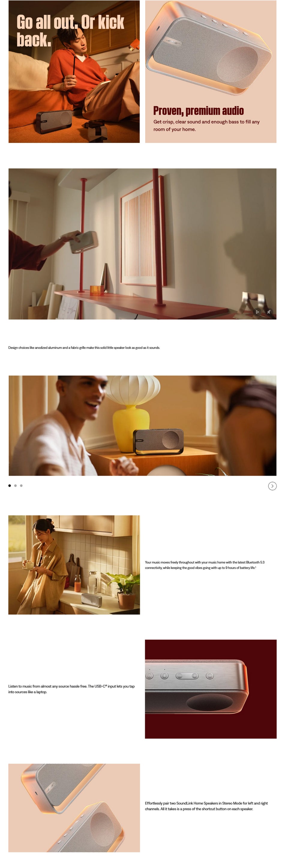 Available exclusively from Bose, the all-new SoundLink Home Speaker brings standout sound from a size that fits in, while chic touches add a premium feel and sleek good looks. Its wireless, too, so you can add music to any room of your home — from bedroom to kitchen and back — matching the space to your musical mood.