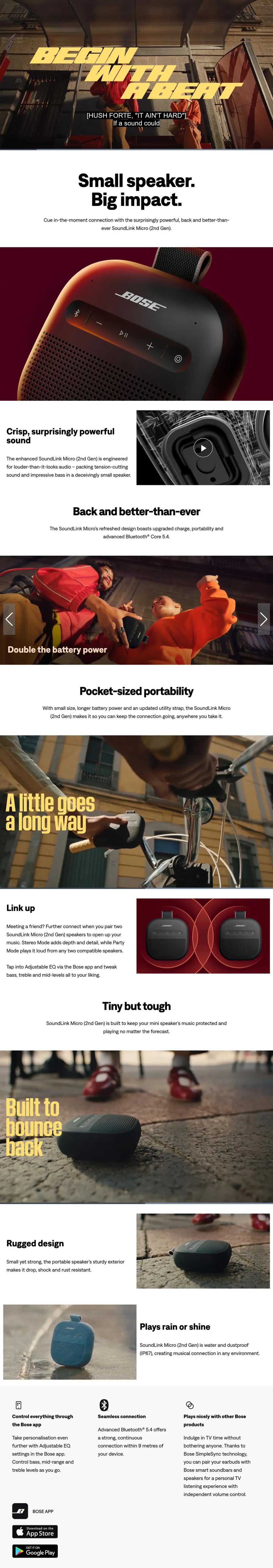 Cue the connection with the back and better-than-ever SoundLink Micro (2nd Gen). Deceivingly small, this portable powerhouse can fit in the palm of your hand, yet still deliver up to 12 hours¹ of crisp sound. This tiny but tough speaker plays rain or shine and is powerful enough to break any silence, anywhere.