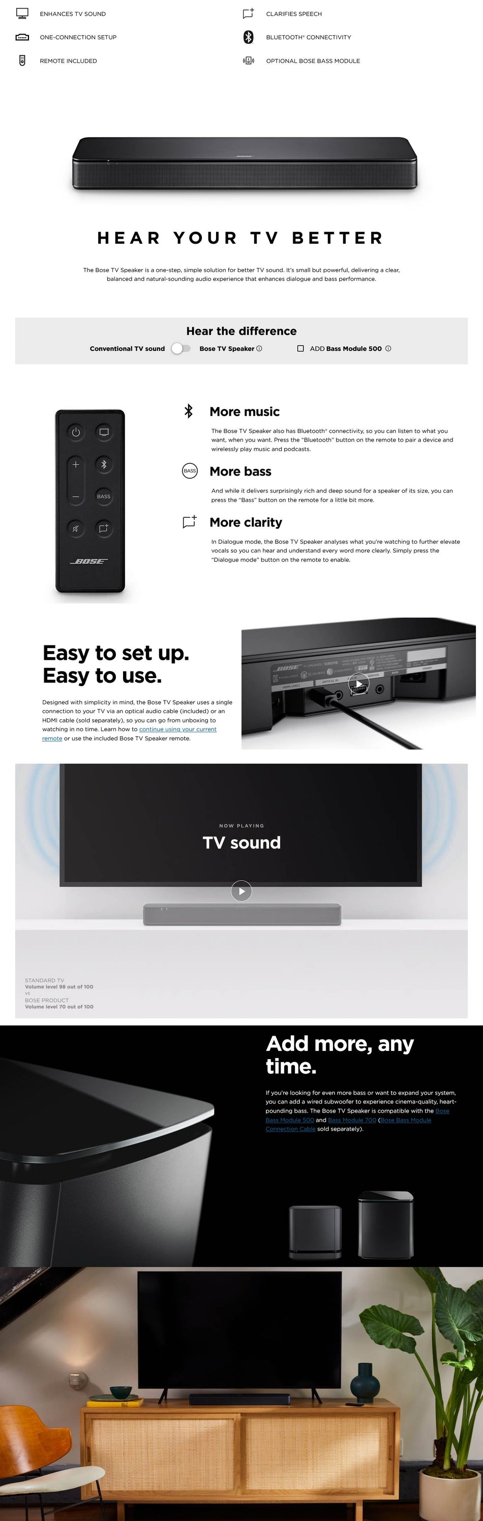 The Bose TV Speaker is a one-step, simple solution for better TV sound. It’s small but powerful, delivering a clear, balanced, and natural-sounding audio experience that enhances dialogue and bass performance.