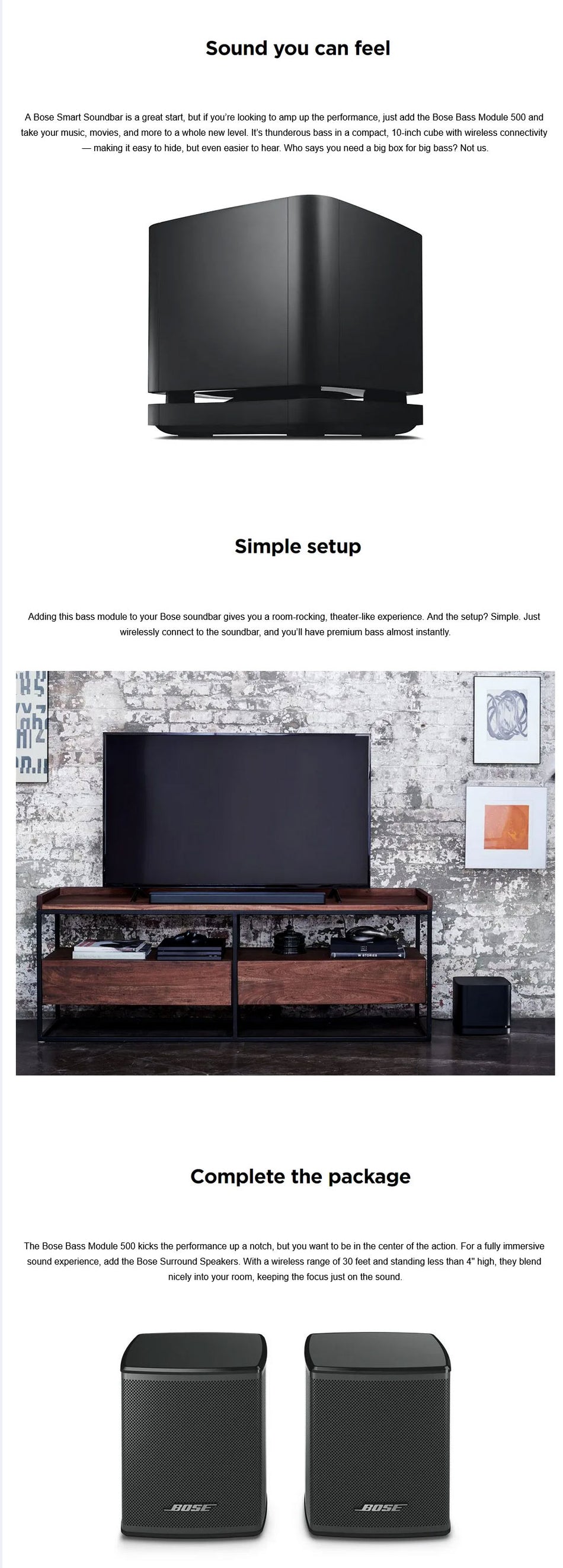 The Bose Soundbar 500 is a great start, but if you’re looking to amp up the performance, just add the Bose Bass Module 500. Designed for the Bose Soundbar 500, the Bose Bass Module 500 takes your music, movies and more to a whole new level.