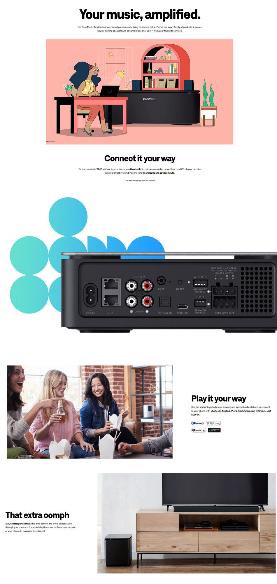 The Bose Music Amplifier connects multiple sources to bring your home to life. Part of our smart family of products, it powers new or existing speakers and streams music over Wi-Fi® from your favorite services.