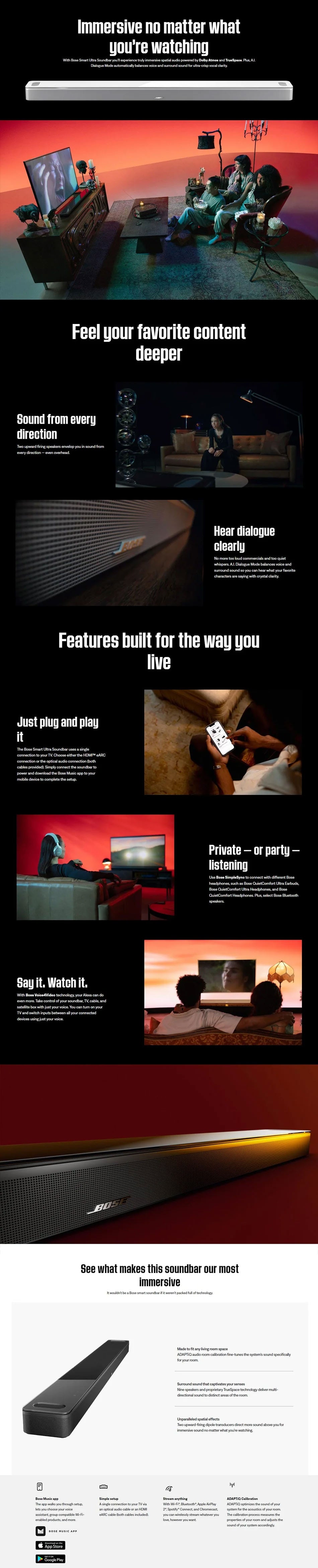 Meet the top-of-the-line soundbar that’s here to pull you deep into the heart of all your favorite content. Bose Smart Ultra Soundbar with Dolby Atmos® and Bose TrueSpace technology separates instruments, dialogue, and effects, and places them in different parts of a room for a truly immersive spatial audio experience like you’ve never heard it before. Having a hard time hearing what your favorite characters are saying? A.I. Dialogue Mode automatically balances voice and surround sound for ultra-crisp vocal clarity. Plus, two upward firing dipole speakers work with Bose technologies to make it feel like your space is filled with sound from every direction — even overhead.